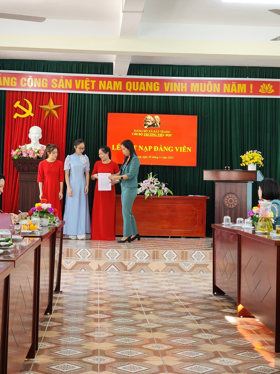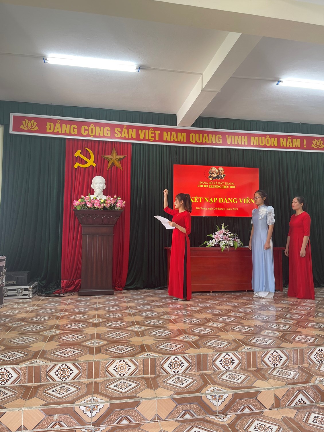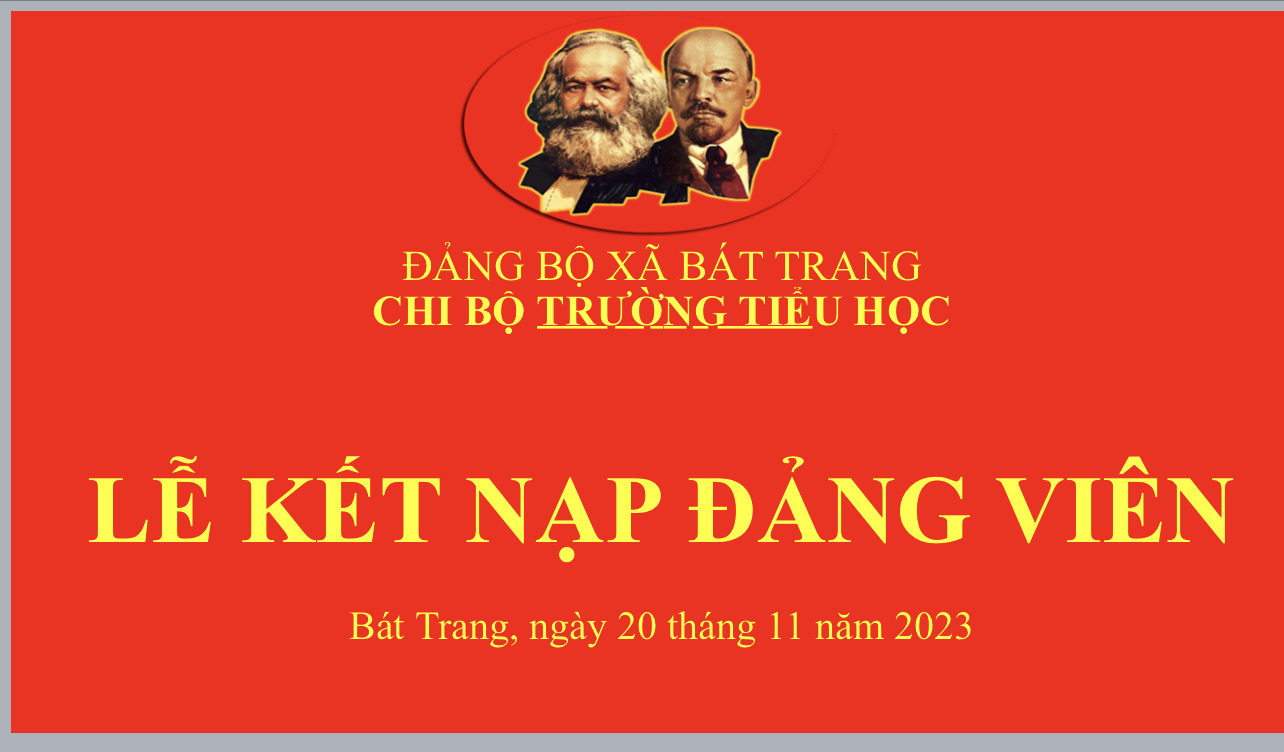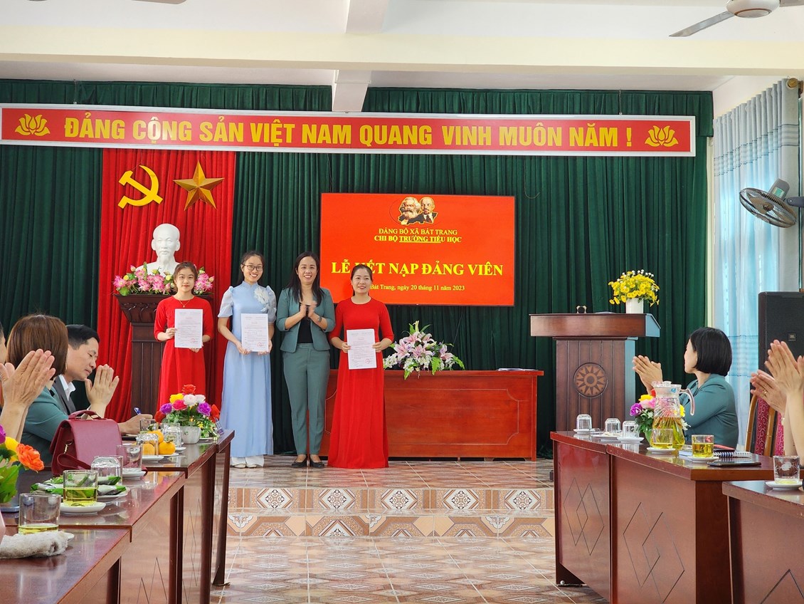 Được sự quan tâm của các Cấp ủy Đảng. Trải qua quá trình tu dưỡng và rèn luyện của quần chúng Cao Thị Mỹ Hương, Lô Nhật Lệ, Lê Thị Thuỳ Trang; Với sự quan tâm, giúp đỡ của các đồng chí Đảng viên trong toàn chi bộ, các đồng chí trong Ban Chấp hành Chi đoàn. Hôm nay, ngày 20/11/2023, Chi bộ TH Bát Trang long trọng tổ chức Lễ kết nạp Đảng viên cho đ/c 03 đ/c ao Thị Mỹ Hương, Lô Nhật Lệ, Lê Thị Thuỳ Trang.