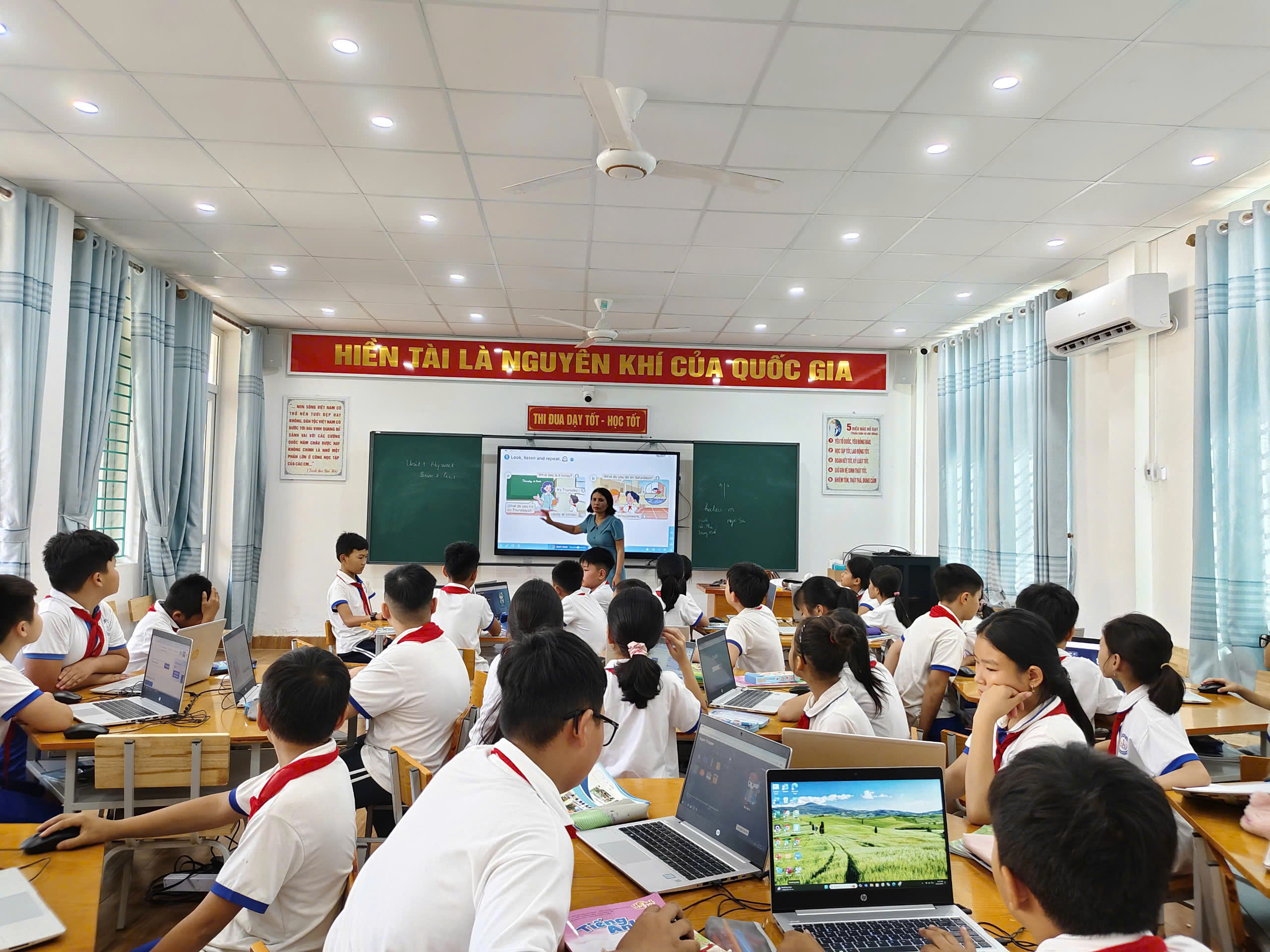 🌺 Chuyển đổi số trong giáo dục được xác định là nhiệm vụ trọng tâm nhằm đổi mới phương pháp giảng dạy học tập góp phần nâng cao chất lượng giáo dục của các môn học nói chung và môn Ngoại ngữ nói riêng. Thực hiện kế hoạch năm học 2024 - 2025, dưới sự chỉ đạo của tổ chuyên môn, nhóm Tiếng Anh đã xây dựng hai tiết dạy tại phòng học thông minh do cô giáo Hoàng Thị Tỵ với bài “ Unit 3: My week-Lesson 2 (Part 1,2,3), môn Tiếng Anh lớp 4 và cô giáo Nguyễn Phương Thảo với bài “Unit 3: My foreign friends-Lesson 2(Part 4,5,6), môn Tiếng Anh lớp 5.